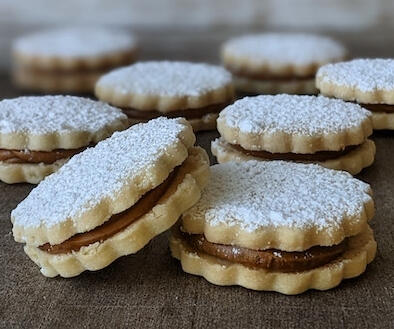 Peruvian Alfajores. Buttery shortbread cookie filled with dulce de leche dusted with powdered sugar. They melt in your mouth!